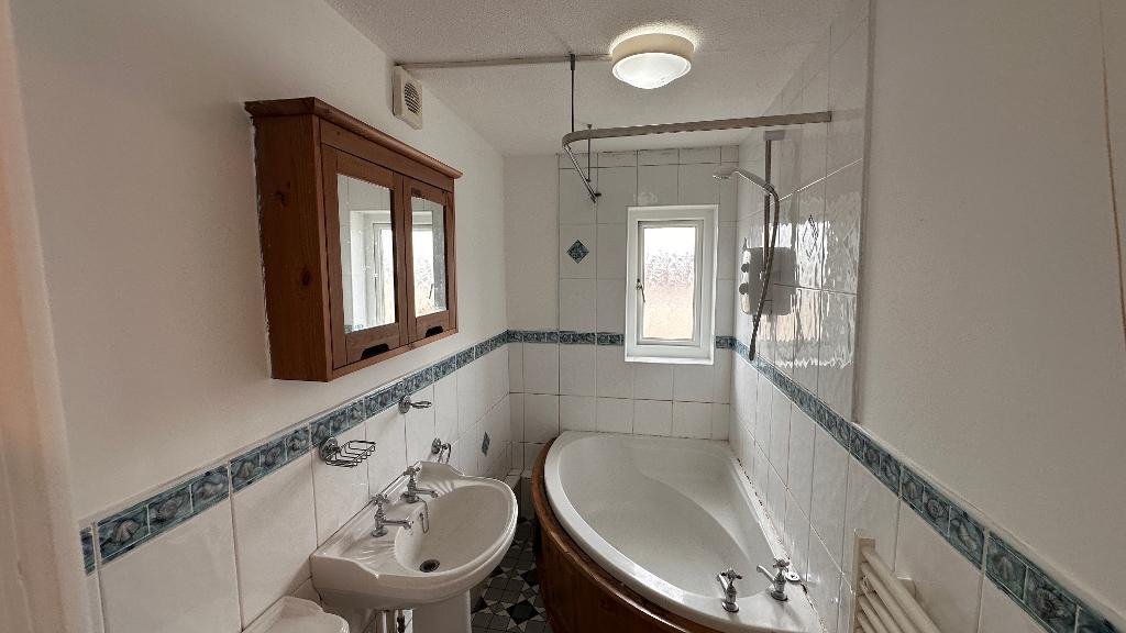 8' 8'' x 4' 7'' (2.65m x 1.41m) Upvc glazed window , papered ceiling, part emulsion plastered walls, tiling to walls, jacuzzi style bath with shower over bath, W/C, handbasin, wall mounted radiator vinyl to flooring.
