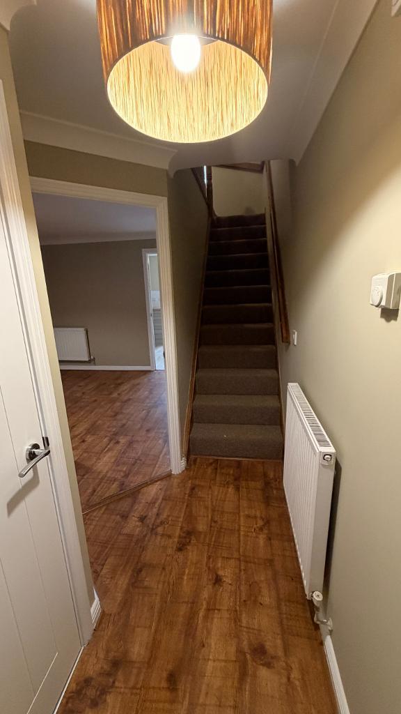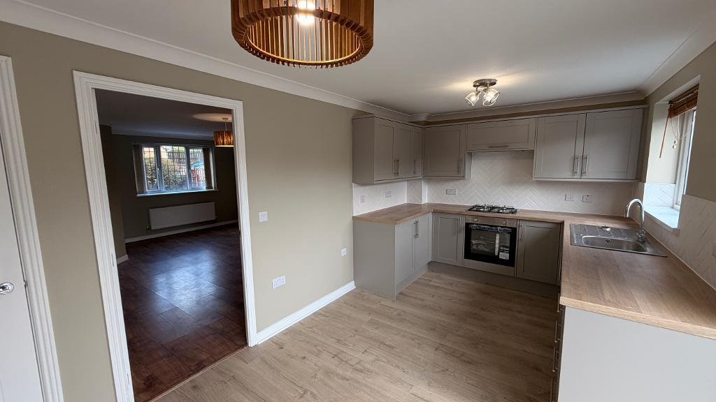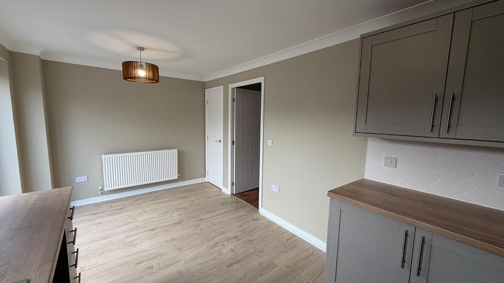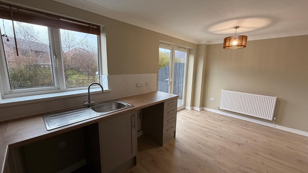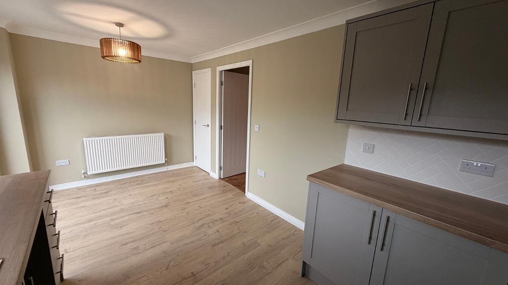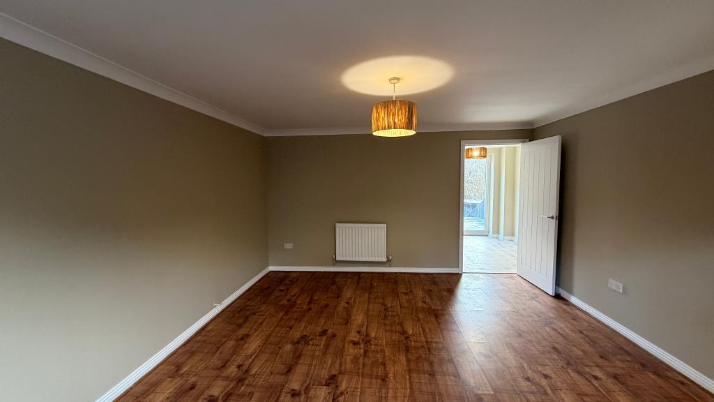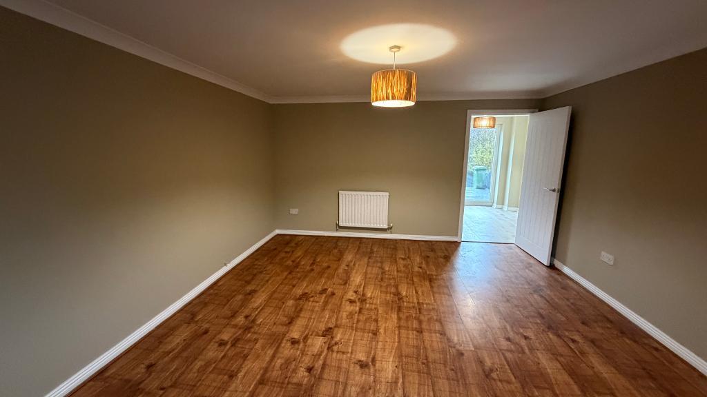 16' 4'' x 9' 0'' (5m x 2.76m) Upvc patio doors leading to garden. Upvc window with fitted blinds. Emulsion plastered ceiling and walls, splash back wall tiling, new fitted kitchen with wall and base units. Integrated cooker with extractor hood. Plumbing for washing machine, floor to ceiling separate storage area. Power points around the room, wall mounted radiator, wood flooring.