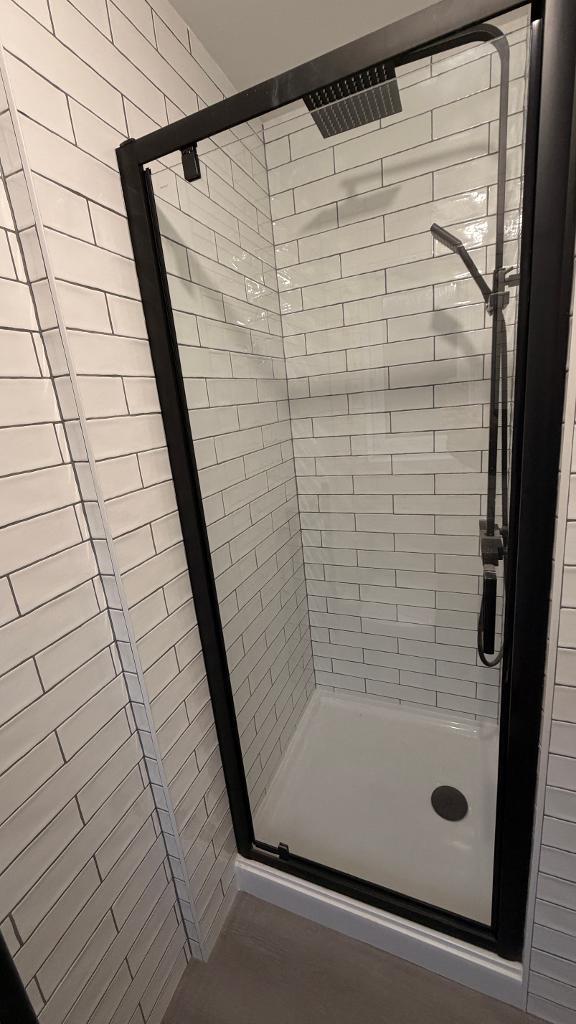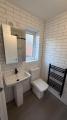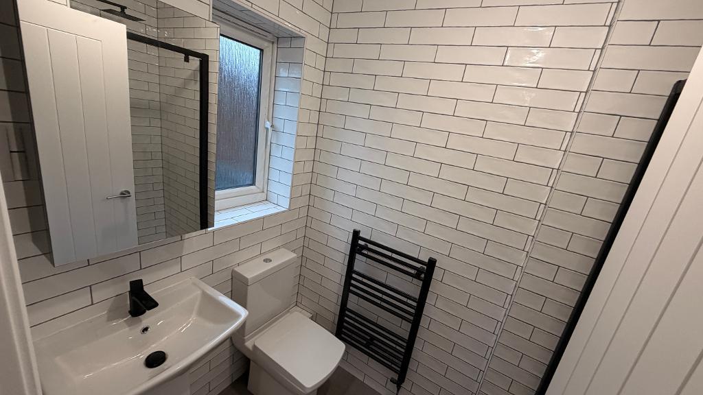 Newly fitted en-suite , Upvc glazed window, emulsion plastered ceiling , W/C , handbasin, stand alone shower decorative wall tiling. wall mounted glass cabinet, wall mounted radiator.