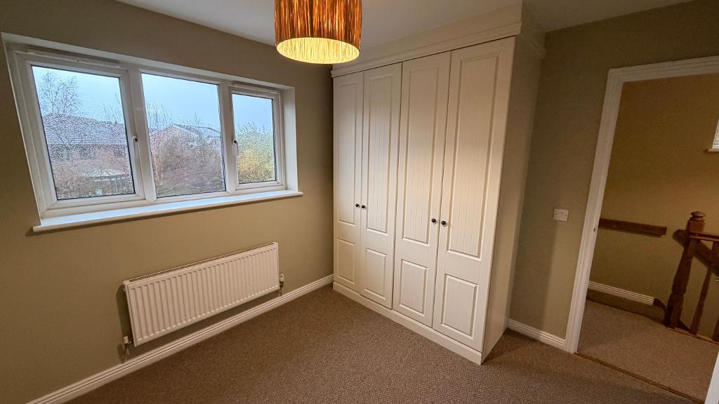 Upvc window, emulsion plastered ceiling and walls, floor to ceiling storage cupboard ( boiler enclosed). Carpet to flooring.
