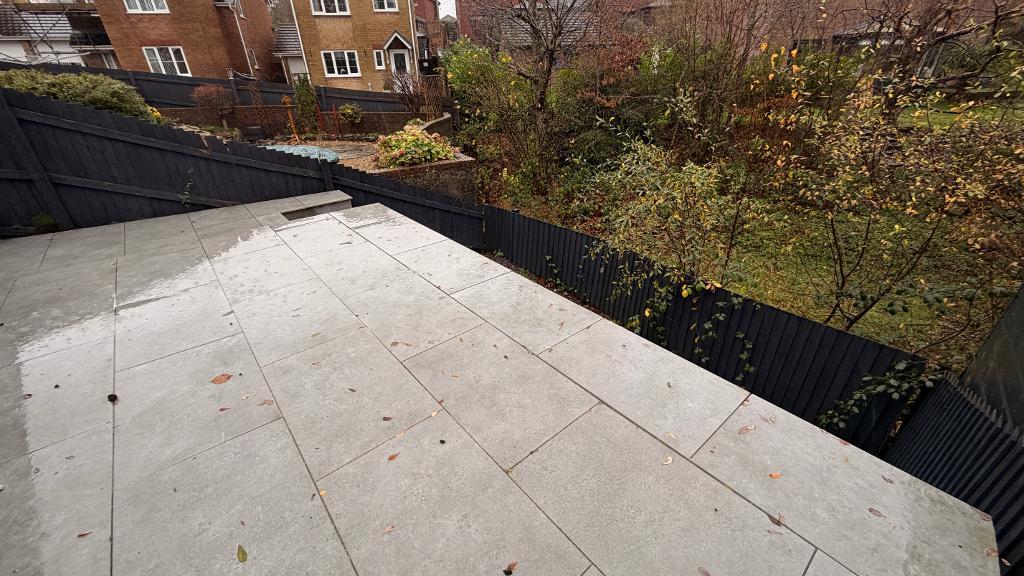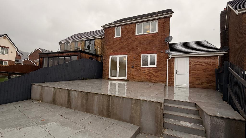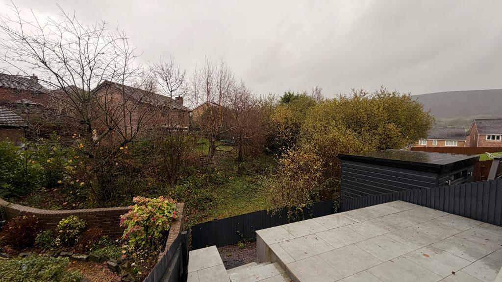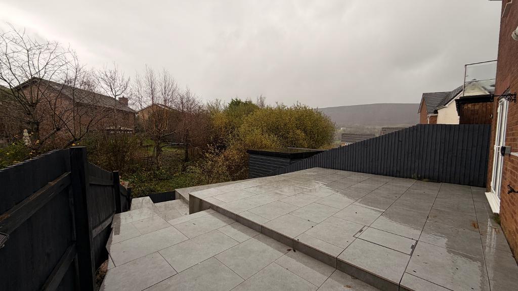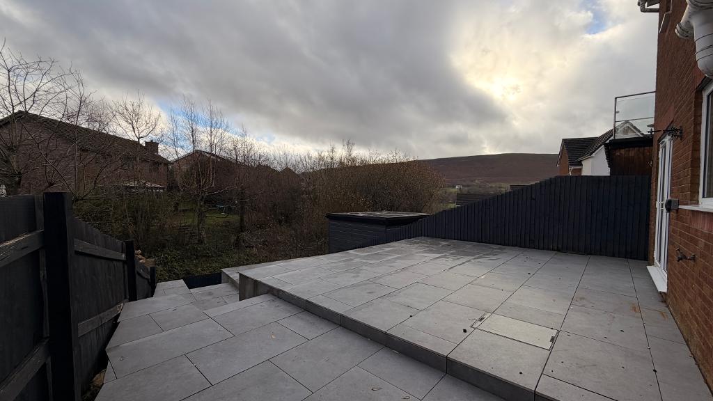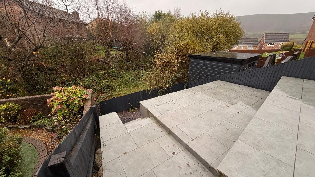 Rear garden can be accessed via a side gate , through the garage and kitchen patio doors. Decorative slate tiling to two levels of the tiered garden. Stunning views of the surrounding area ( south facing)