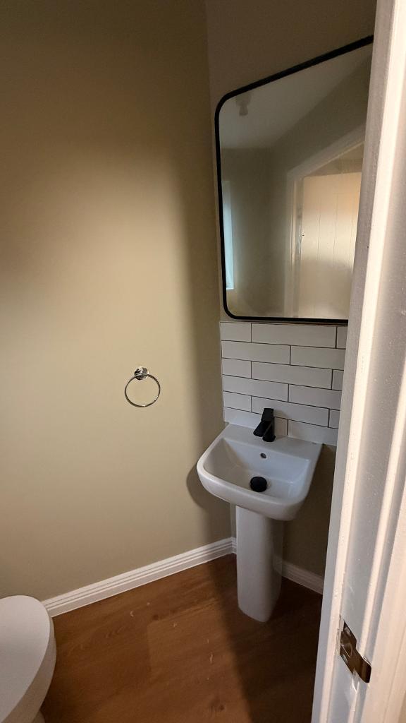 4' 11'' x 2' 11'' (1.51m x 0.9m) Upvc glazed window. Emulsion plastered ceiling and walls, wall mounted mirror, handbasin, W/C, wall mounted radiator, wood flooring.