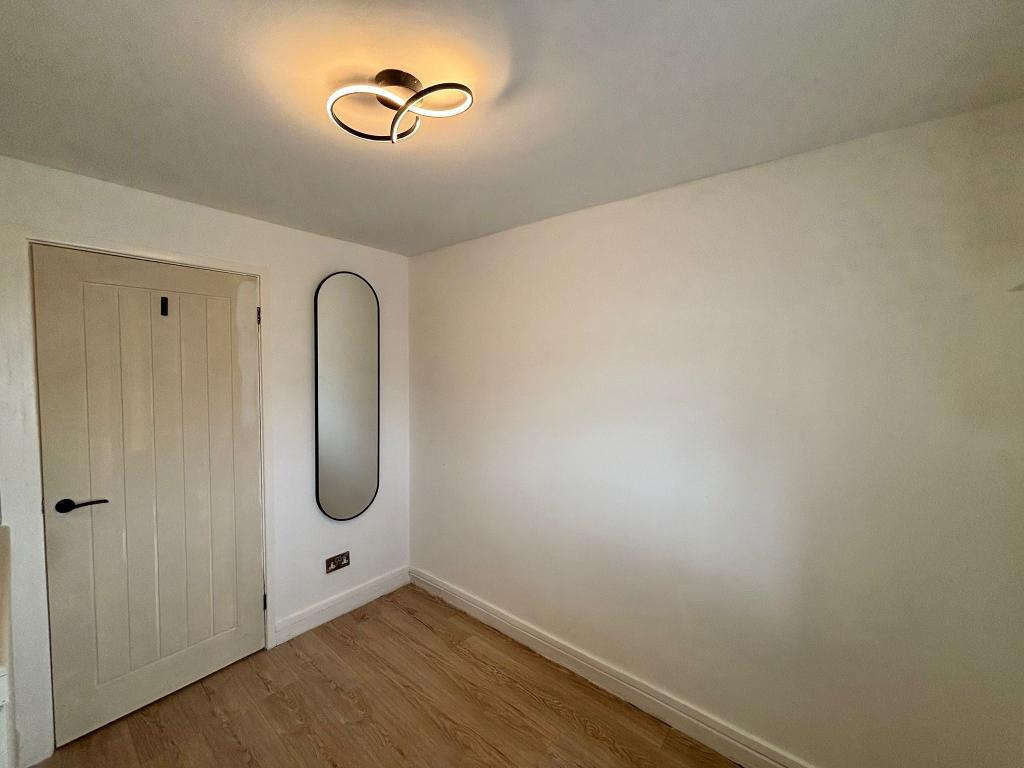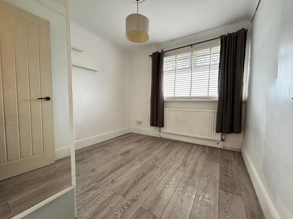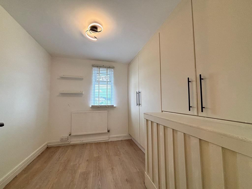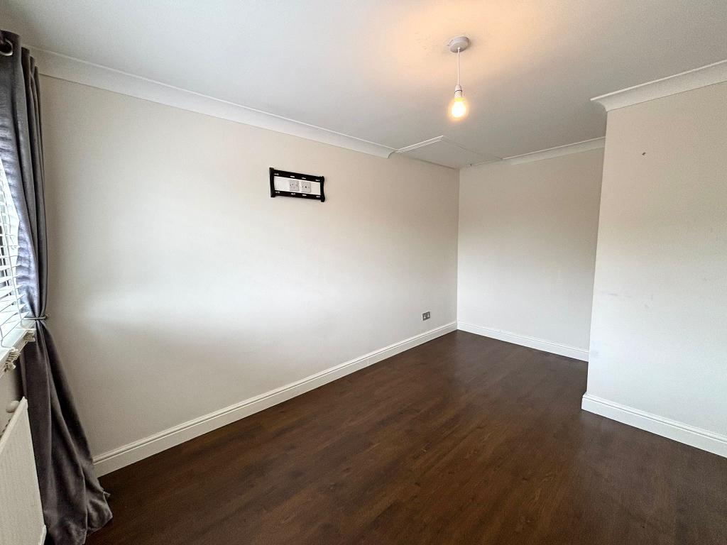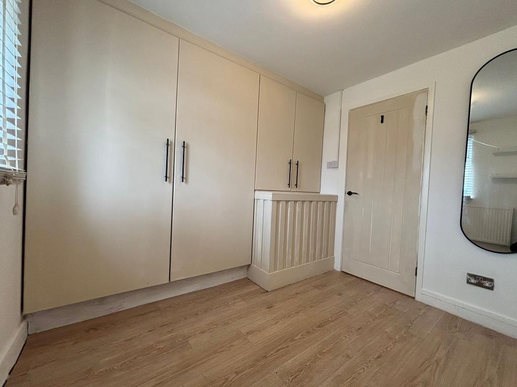 Upvc window (fitted blinds), emulsion plastered ceiling and walls. Wall mounted radiators, wood flooring, floor to ceiling wardrobes. Power points around the room.