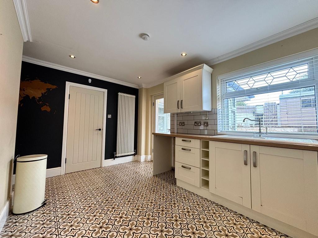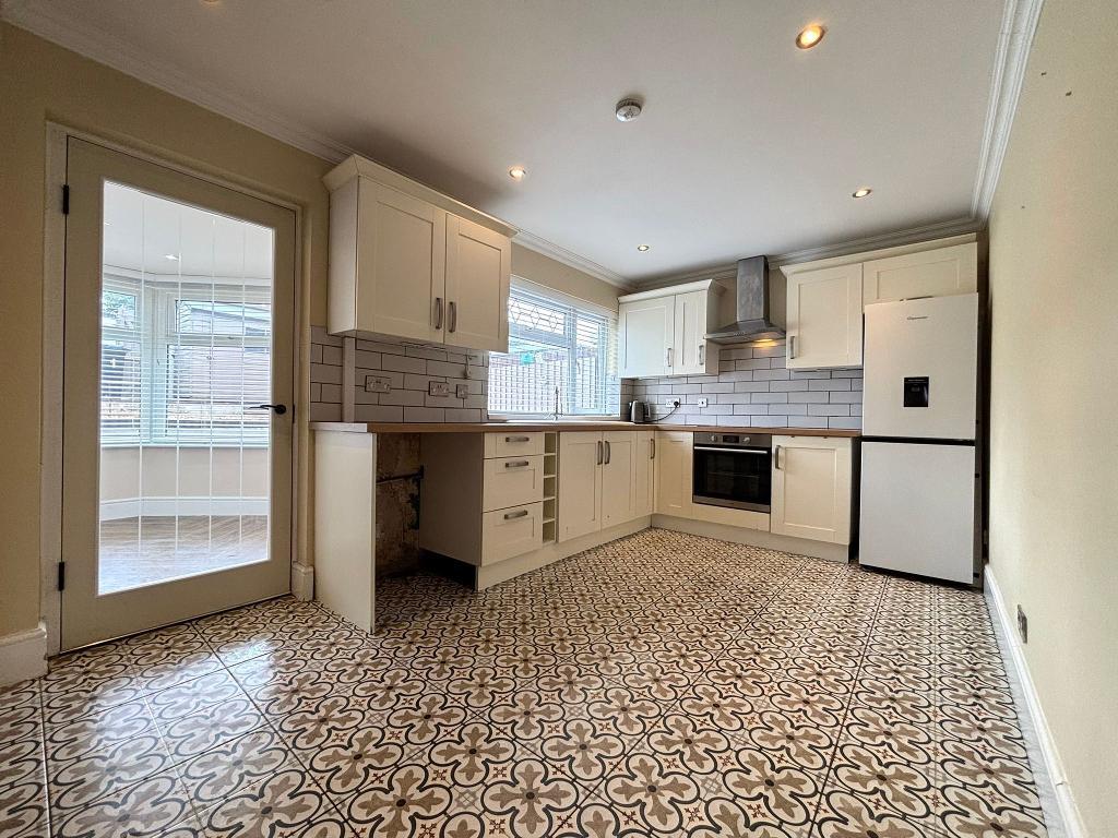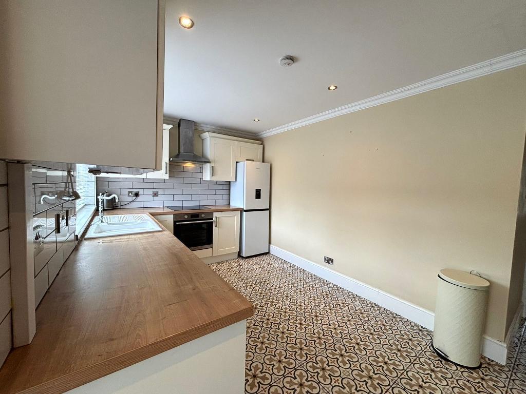 Fitted kitchen with wall and base units, sink, integrated cooker , stainless stell extractor hood, standalone fridge freezer, splash back wall tiling. Wall mounted radiators, tiled flooring, power points around the room.