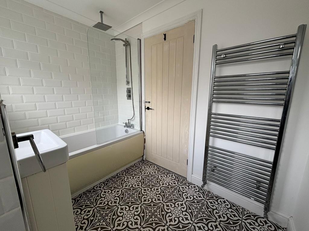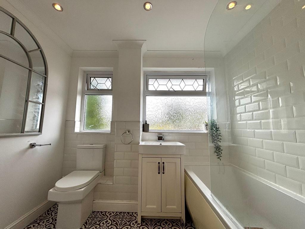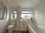 Upvc windows (glazed), emulsion plastered ceiling (inset spotlights) and part walls. Tiled walls , W/C, bath, handbasin with cabinet, wall mounted radiators, vinyl to flooring.