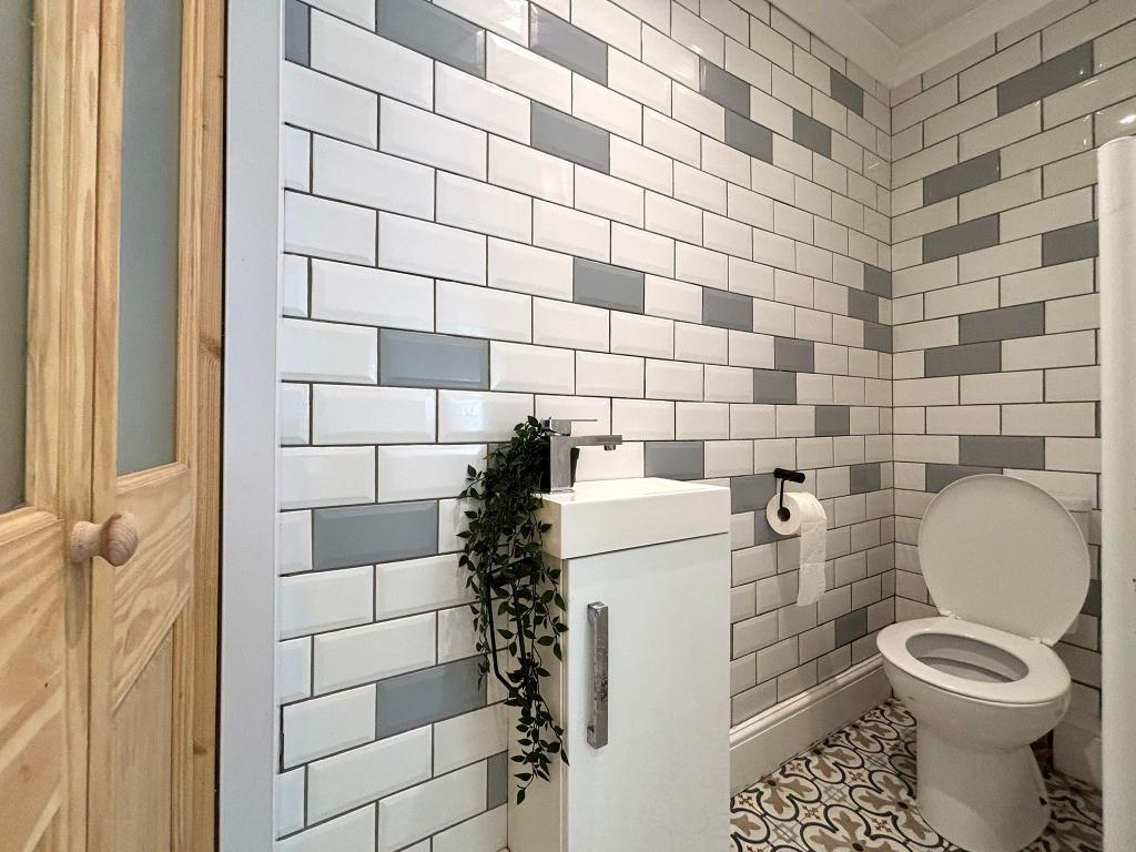 7' 0'' x 2' 8'' (2.15m x 0.83m) Emulsion plastered ceiling and part walls, tiling to walls, W/C , handbasin. Wall mounted radiators, vinyl to flooring, floor to ceiling storage.