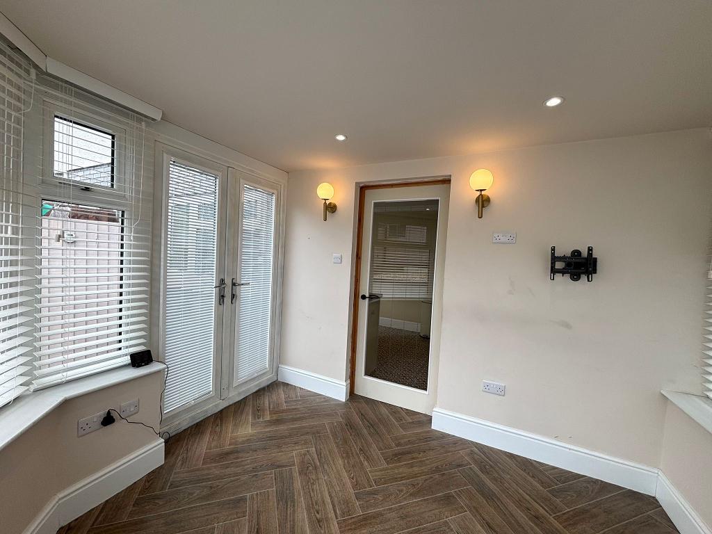 Upvc patio door and windows (fitted blinds), emulsion plastered ceiling (inset spot lights) and walls, vinyl to flooring, power points around the room.