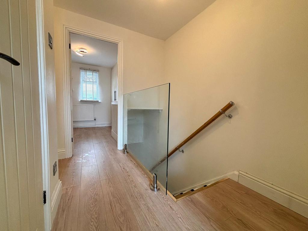 Emulsion plastered ceiling and walls, glass balustrade wood flooring, attic hatch to roof.