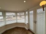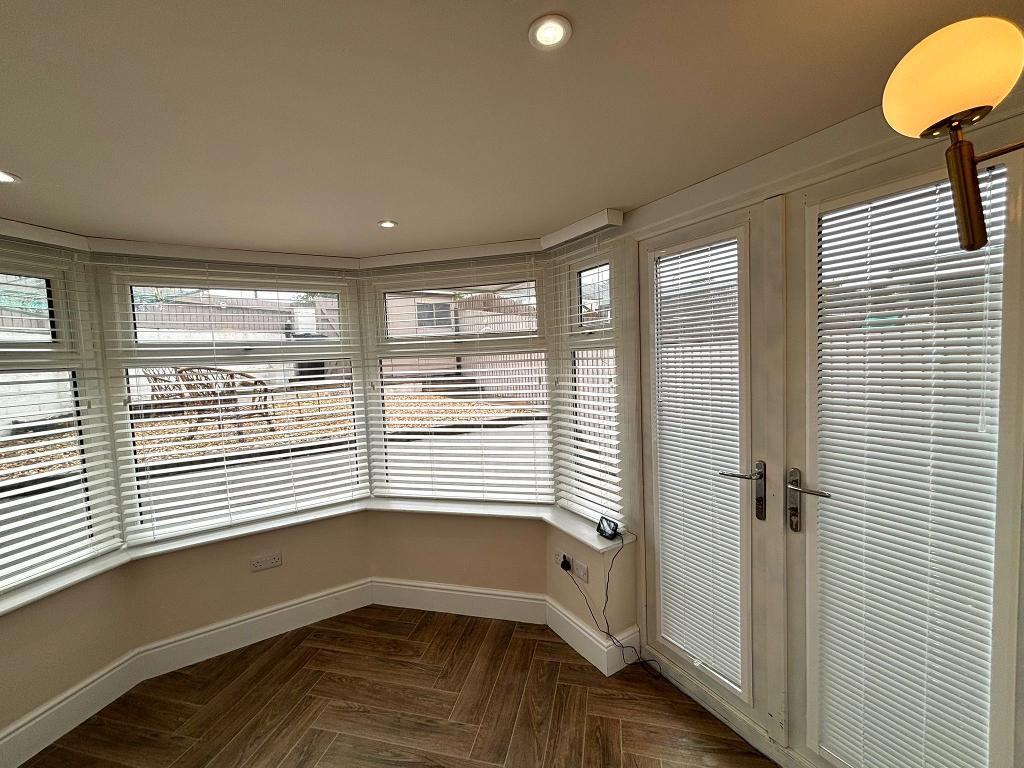Upvc window (fitted blinds), views of the garden, emulsion plastered ceiling (inset spot lights) and walls.